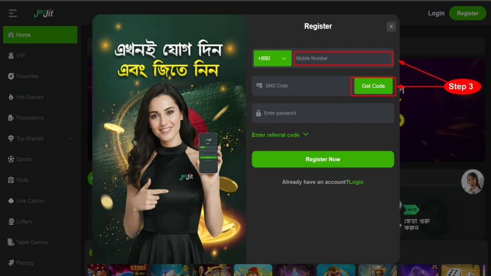 Enter your active Bangladeshi mobile number in the provided field, then click “Get Code” to receive a verification code.